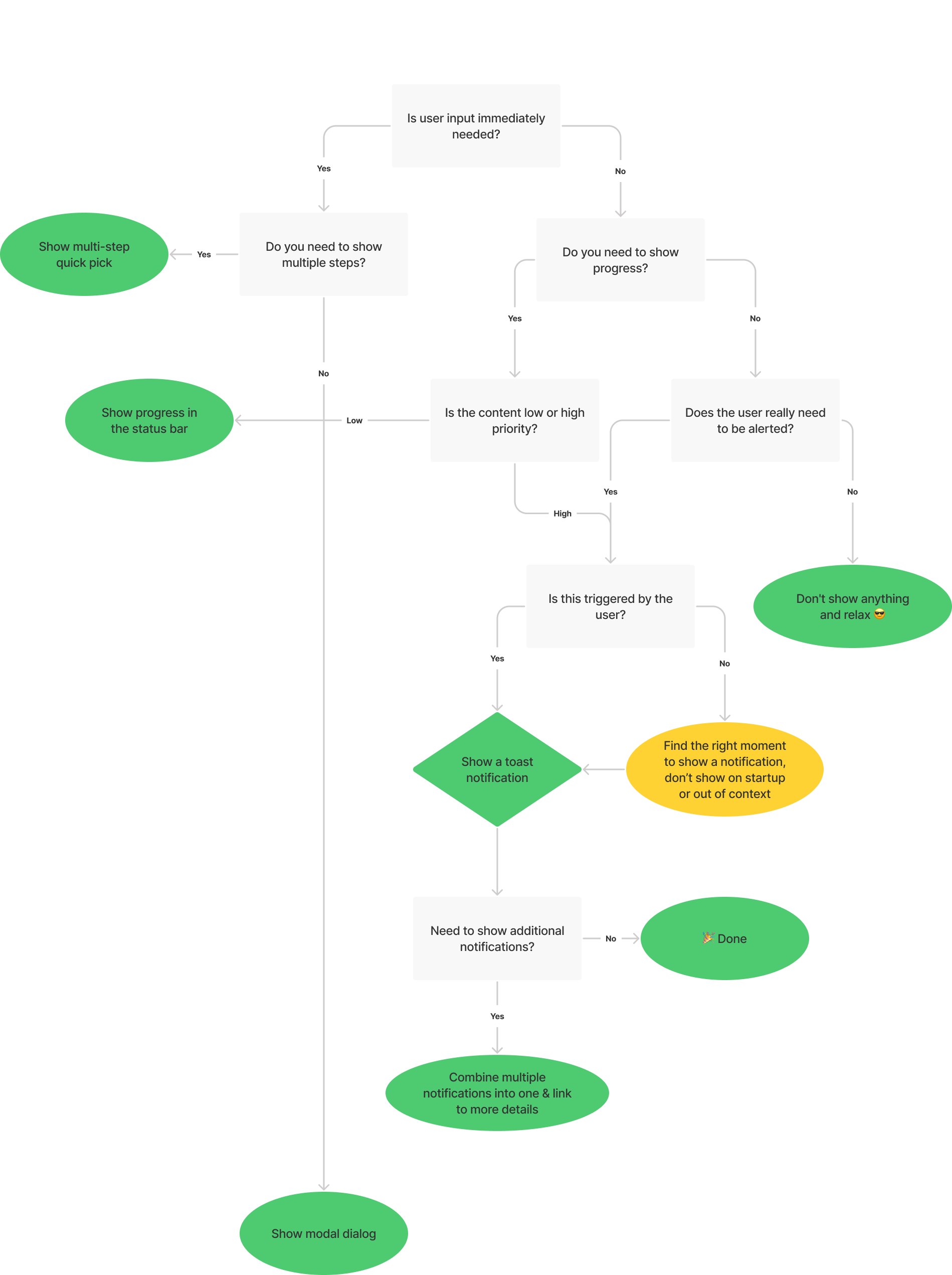 Es ist wichtig, die Anzahl der gesendeten Benachrichtigungen zu begrenzen, um die Aufmerksamkeit des Benutzers zu respektieren. Um Ihnen bei der Entscheidung zu helfen, ob Sie eine Benachrichtigung anzeigen sollten oder nicht, folgen Sie bitte unserem Entscheidungsbaum für Benachrichtigungen.