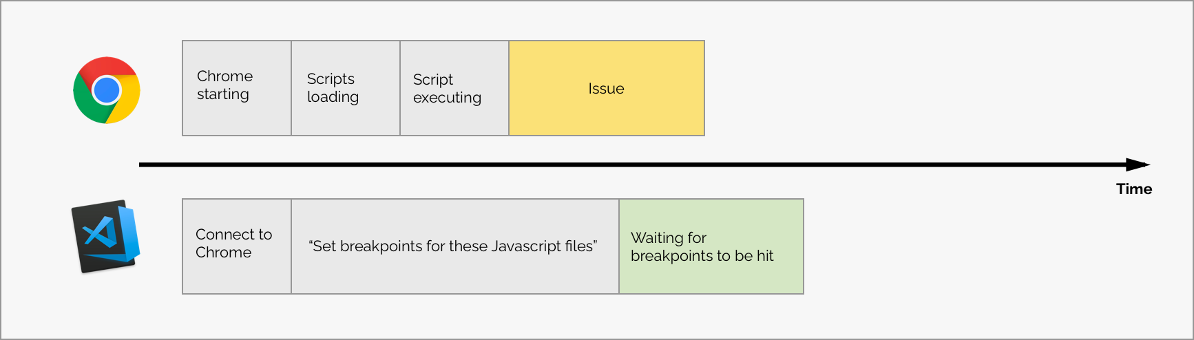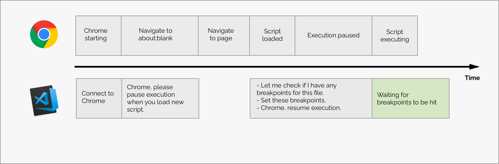 Viele Benutzer haben die Erfahrung gemacht, dass ihre Breakpoints beim Starten von Chrome nicht getroffen werden. Zu ihrer Verwirrung werden ihre Breakpoints nach einem einfachen Seiten-Refresh getroffen. Warum sollte das so sein? Es ist etwas kompliziert, aber es kommt auf ein Timing-Problem zwischen VS Code und Chrome an, das am besten in einer Zeitachse dargestellt wird.